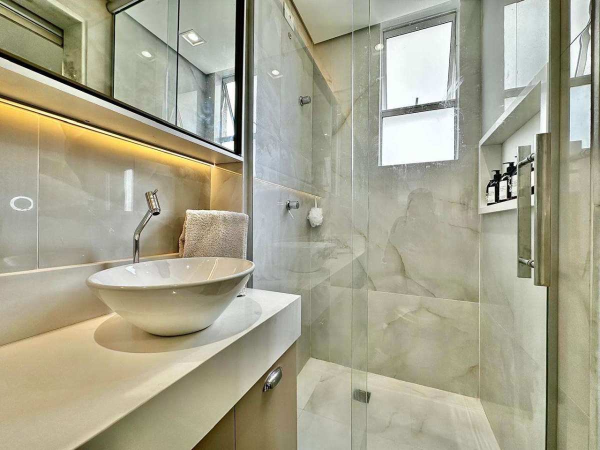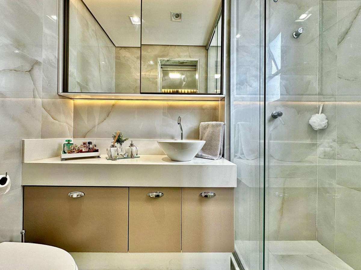 * Banheiro social c/ bancada em NANOGLASS, box e armários